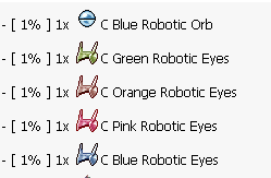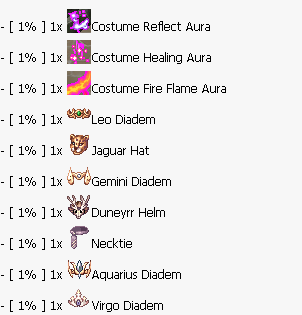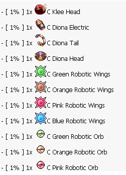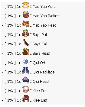 <table><thead><tr><th width="100">Chance</th><th width="325">Item Name</th></tr></thead><tbody><tr><td>1%</td><td>🟡 C. Yao Yao Aura</td></tr><tr><td>1%</td><td>🧺 C. Yao Yao Basket</td></tr><tr><td>1%</td><td>🎀 C. Yao Yao Head</td></tr><tr><td>1%</td><td>🐾 C. Saya Pet</td></tr><tr><td>1%</td><td>🐈 C. Saya Tail</td></tr><tr><td>1%</td><td>🐱 C. Saya Head</td></tr><tr><td>1%</td><td>🔵 C. Qiqi Orb</td></tr><tr><td>1%</td><td>📿 C. Qiqi Necklace</td></tr><tr><td>1%</td><td>🎭 C. Qiqi Head</td></tr><tr><td>1%</td><td>🧸 C. Klee Pet</td></tr><tr><td>1%</td><td>🎒 C. Klee Bag</td></tr><tr><td>1%</td><td>⛑️ C. Klee Head</td></tr><tr><td>1%</td><td>⚡ C. Diona Electric</td></tr><tr><td>1%</td><td>🐾 C. Diona Tail</td></tr><tr><td>1%</td><td>😺 C. Diona Head</td></tr><tr><td>1%</td><td>🪽🟩 C. Green Robotic Wings</td></tr><tr><td>1%</td><td>🪽🟧 C. Orange Robotic Wings</td></tr><tr><td>1%</td><td>🪽🩷 C. Pink Robotic Wings</td></tr><tr><td>1%</td><td>🪽🟦 C. Blue Robotic Wings</td></tr><tr><td>1%</td><td>🟢🔮 C. Green Robotic Orb</td></tr><tr><td>1%</td><td>🟠🔮 C. Orange Robotic Orb</td></tr><tr><td>1%</td><td>💗🔮 C. Pink Robotic Orb</td></tr><tr><td>1%</td><td>🔵🔮 C. Blue Robotic Orb</td></tr><tr><td>1%</td><td>👁️🟩 C. Green Robotic Eyes</td></tr><tr><td>1%</td><td>👁️🟧 C. Orange Robotic Eyes</td></tr><tr><td>1%</td><td>👁️🩷 C. Pink Robotic Eyes</td></tr><tr><td>1%</td><td>👁️🟦 C. Blue Robotic Eyes</td></tr><tr><td>1%</td><td>☂️ Umbrella Hat</td></tr><tr><td>1%</td><td>🕶️ T Sunglasses</td></tr><tr><td>1%</td><td>✨ Costume Reflect Aura</td></tr><tr><td>1%</td><td>✨ Costume Healing Aura</td></tr><tr><td>1%</td><td>✨ Costume Fire Flame Aura</td></tr><tr><td>1%</td><td>🦁 Leo Diadem</td></tr><tr><td>1%</td><td>🐆 Jaguar Hat</td></tr><tr><td>1%</td><td>♊ Gemini Diadem</td></tr><tr><td>1%</td><td>🛡️ Duneyrr Helm</td></tr><tr><td>1%</td><td>👔 Necktie</td></tr><tr><td>1%</td><td>♒ Aquarius Diadem</td></tr><tr><td>1%</td><td>♍ Virgo Diadem</td></tr></tbody></table>